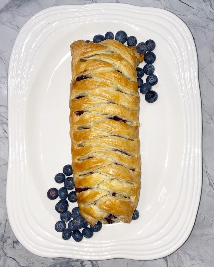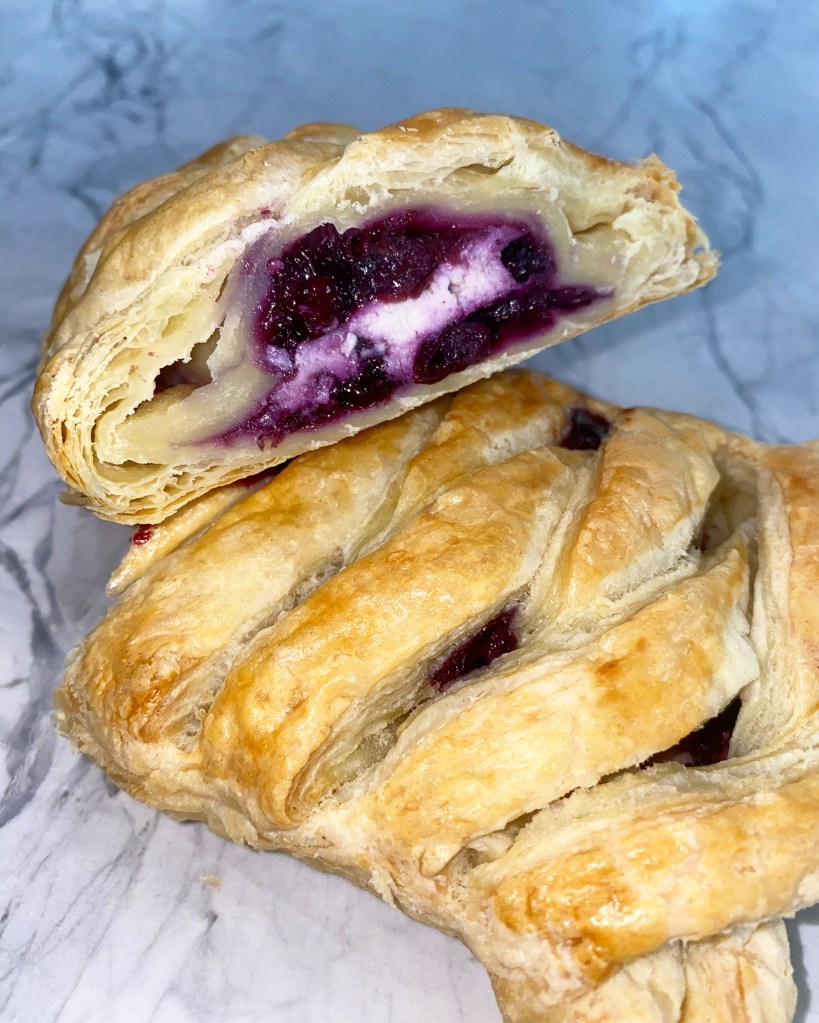 Puff Pastry with Boarshead's Wild Blueberry Chevre and homemade blueberry sauce. Enjoy for breakfast and dessert.