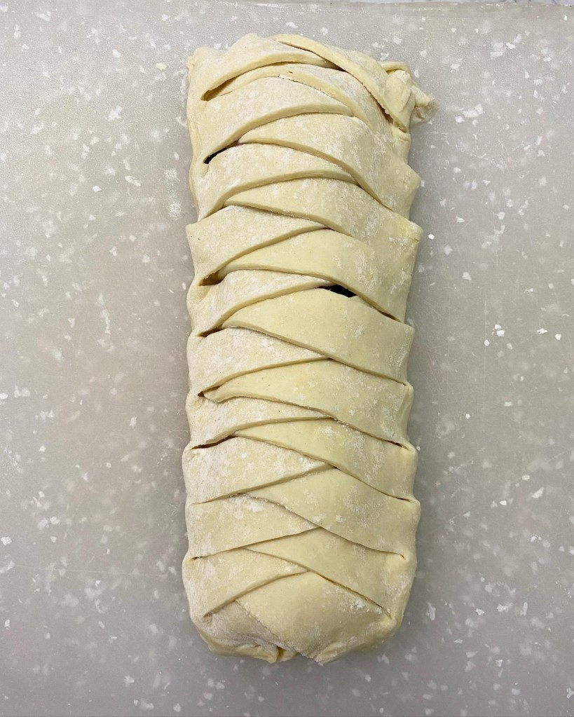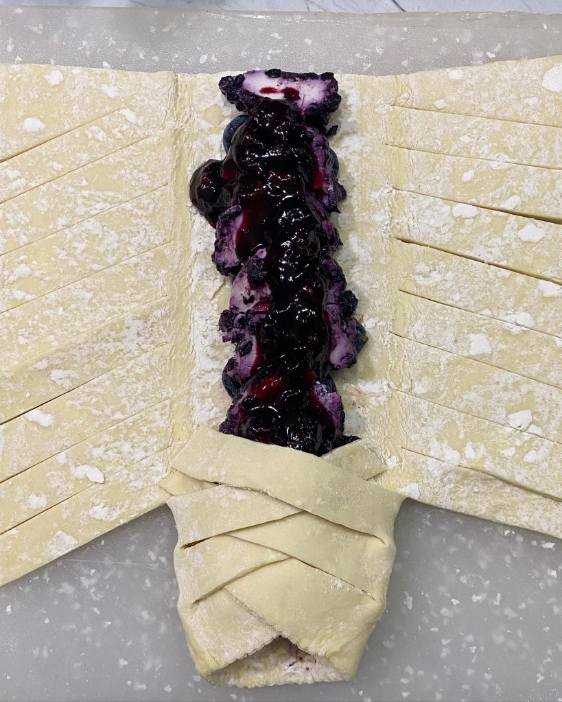 - Fold in each side of the puff pastry alternating from one side to the next in order to create the “braided” look.