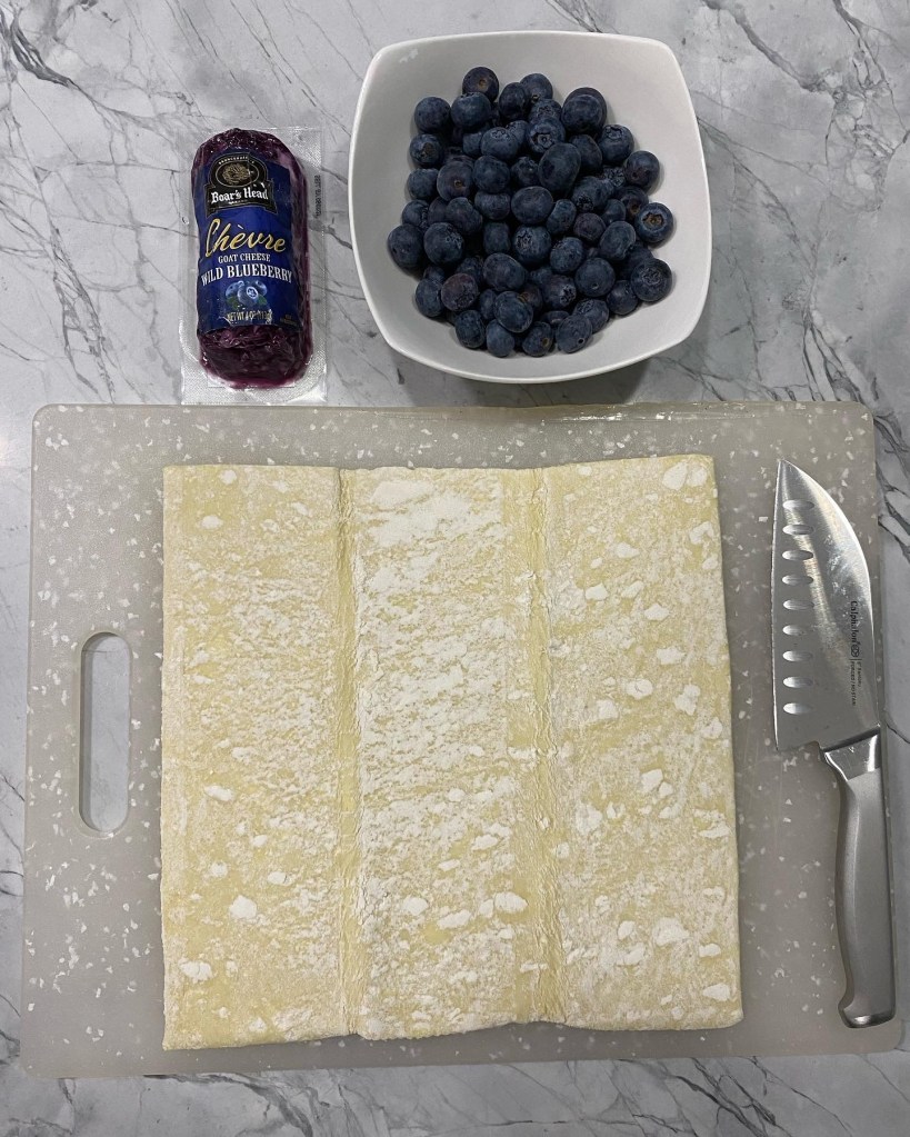 Any goat cheese lovers out there? Last Friday I went to the grocery store to buy cheese and crackers and when I was picking out cheese I saw Boarshead Wild Blueberry Chévre Goat Cheese that I couldn’t resist putting in my cart. On my way to the checkout, I saw some puffed pastry’s and thought, “I bet this cheese would taste good in one of those.” So here we are! If you want the easy and fast way of making this you can buy frozen sheets by Pepperidge Farm at most grocery stores or you can follow this easy recipe to make your own by Baking A Moment.