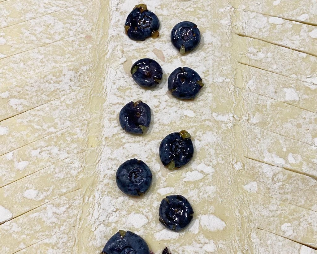 - Place 1/4 cup blueberries in the middle of the puff pastry. I like to smash them first so that they don’t roll around.