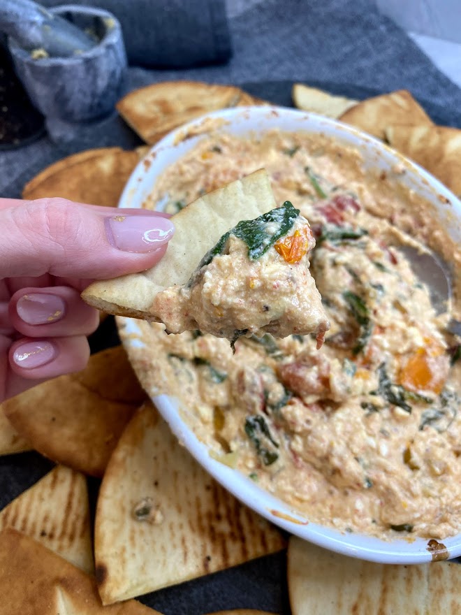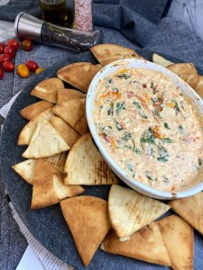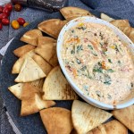Bake for 30 minutes and then carefully take dip out of the oven. While cooking, prep Pita Chips.