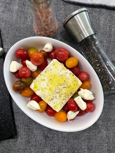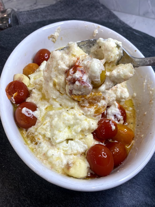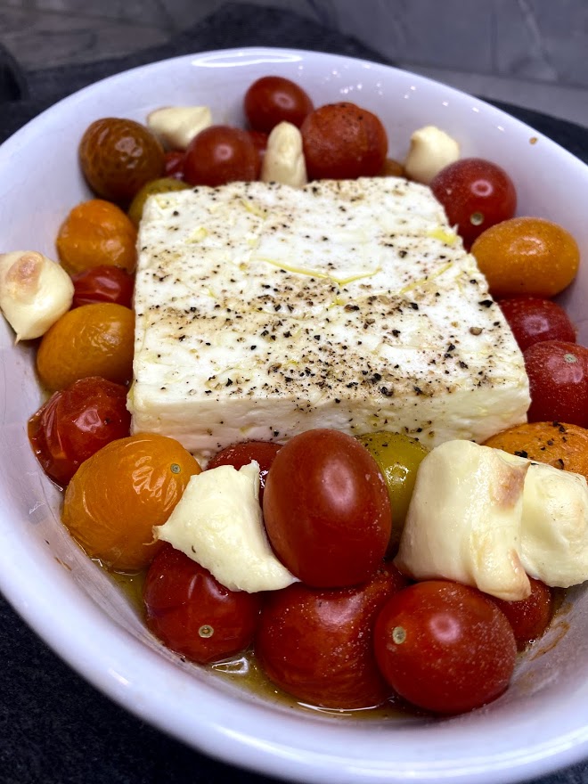 If you have downloaded TikTok than you probably have seen the Feta block pasta with Cherry Tomatoes. A viral video of a someone baking a block of feta, cherry tomatoes, olive oil and some herbs and spices. and mixing it with pasta has caught the eye of many, and for good reason! It’s a great idea and that is what inspired this appetizer. However, I couldn’t leave out my favorite ingredient, roasted garlic!