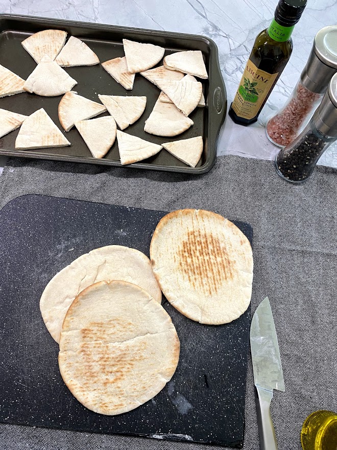 - Cut Pita bread into 6 triangles each and put on a non-stick baking sheet.