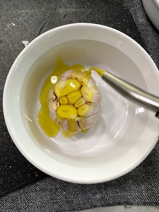 - Put garlic in baking pan cut side up so you can see the garlic cloves and drizzle with 1 tbsp of olive oil.