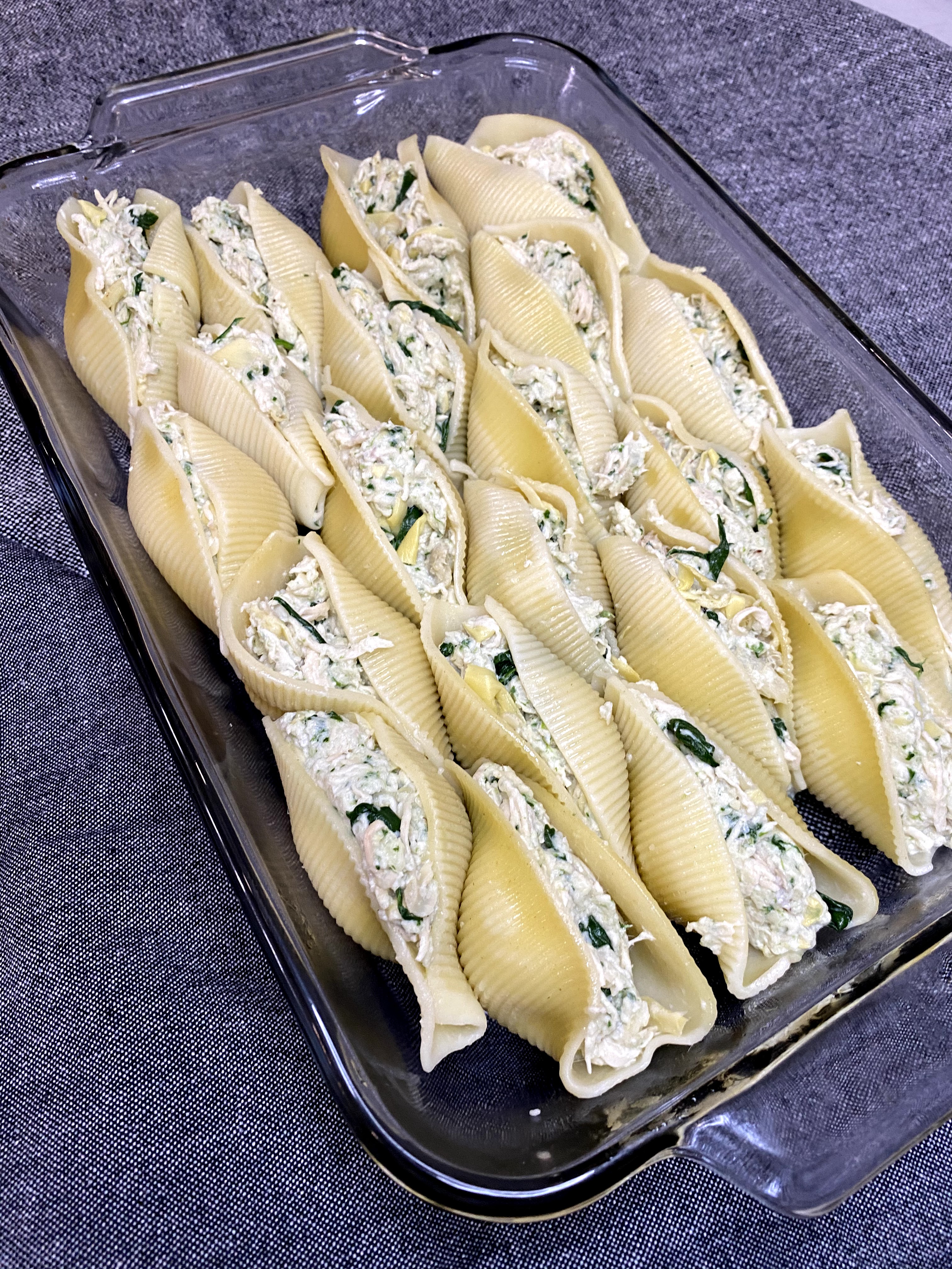 - Stuff shells with 2 Tbsp. of Chicken Artichoke stuffing and place in rows next to each other in a 8×11 baking container.
