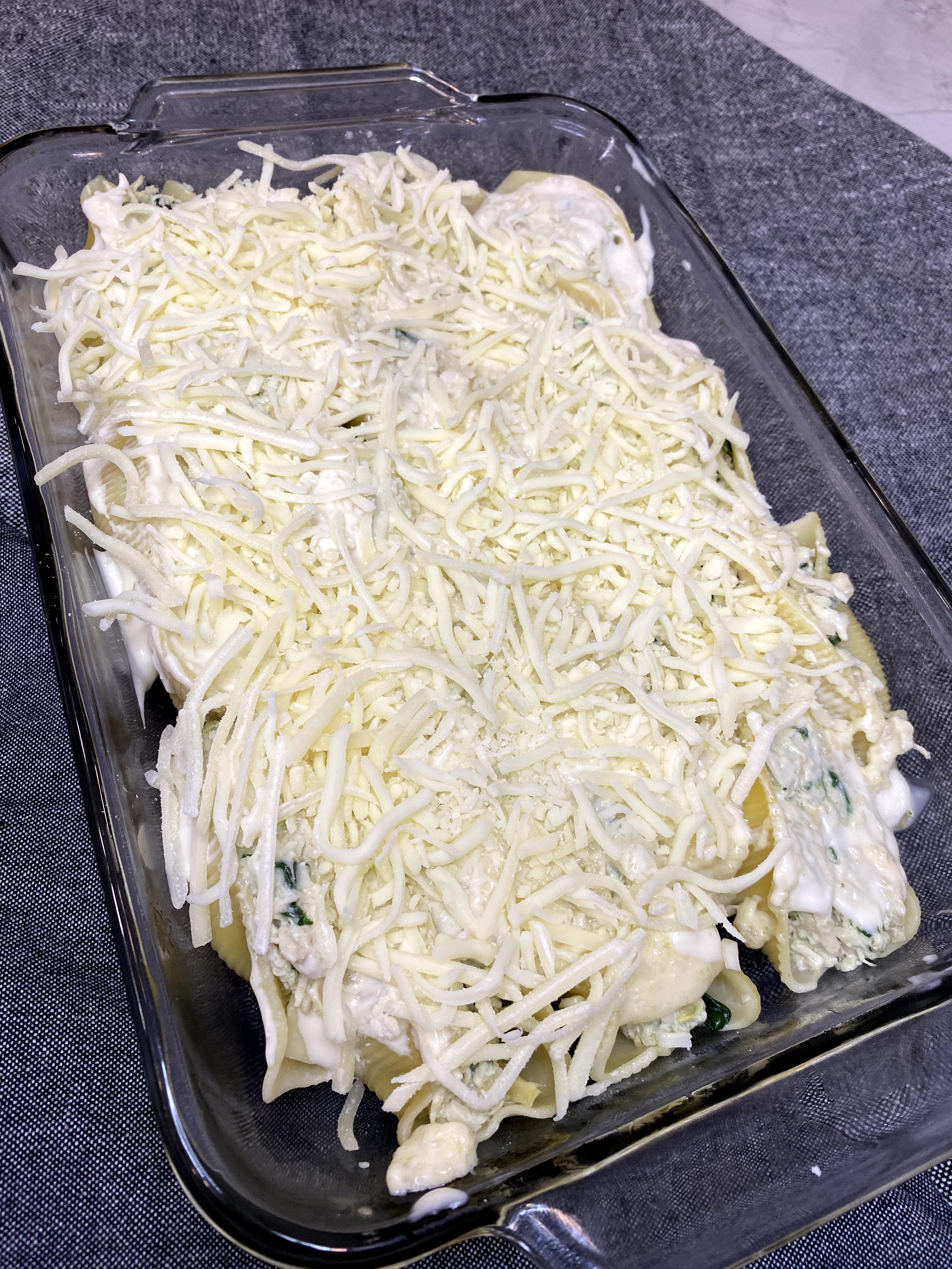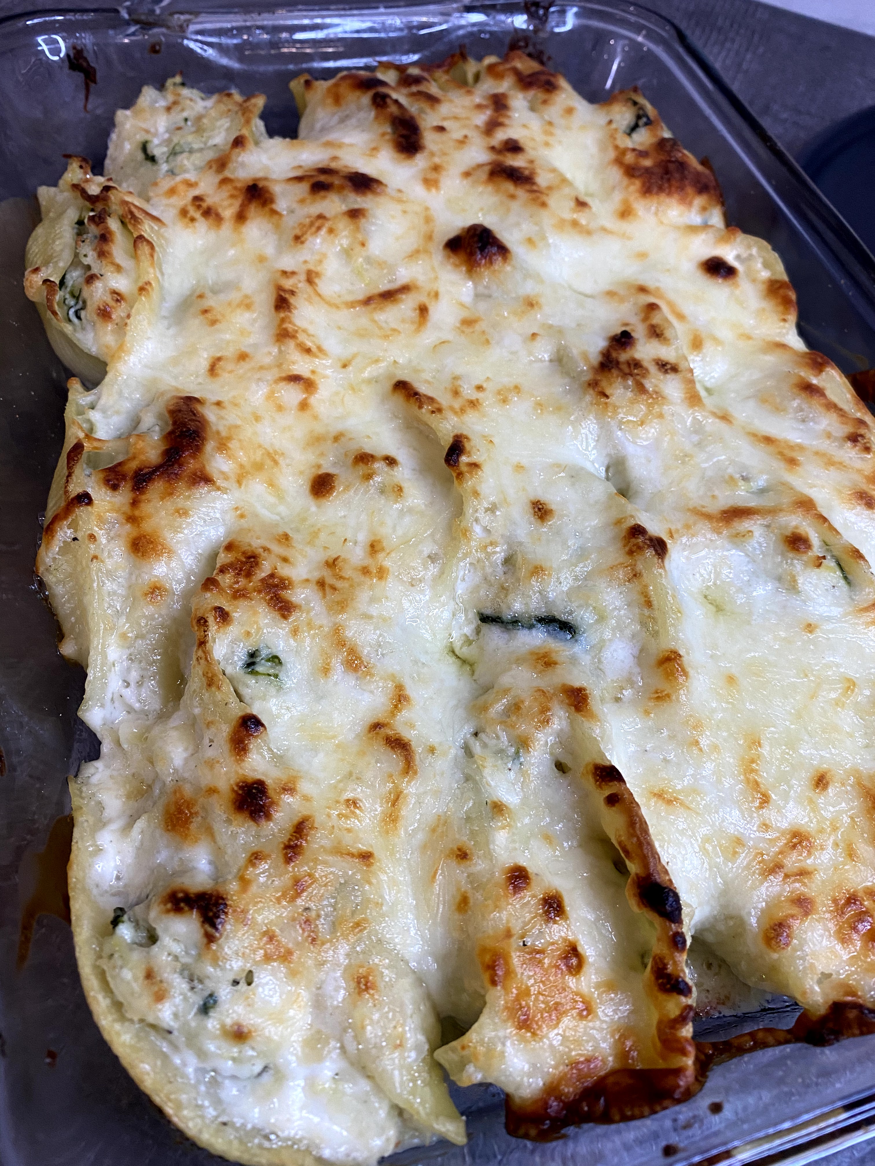 Stuffed shells with shredded chicken and spinach artichoke "dip".