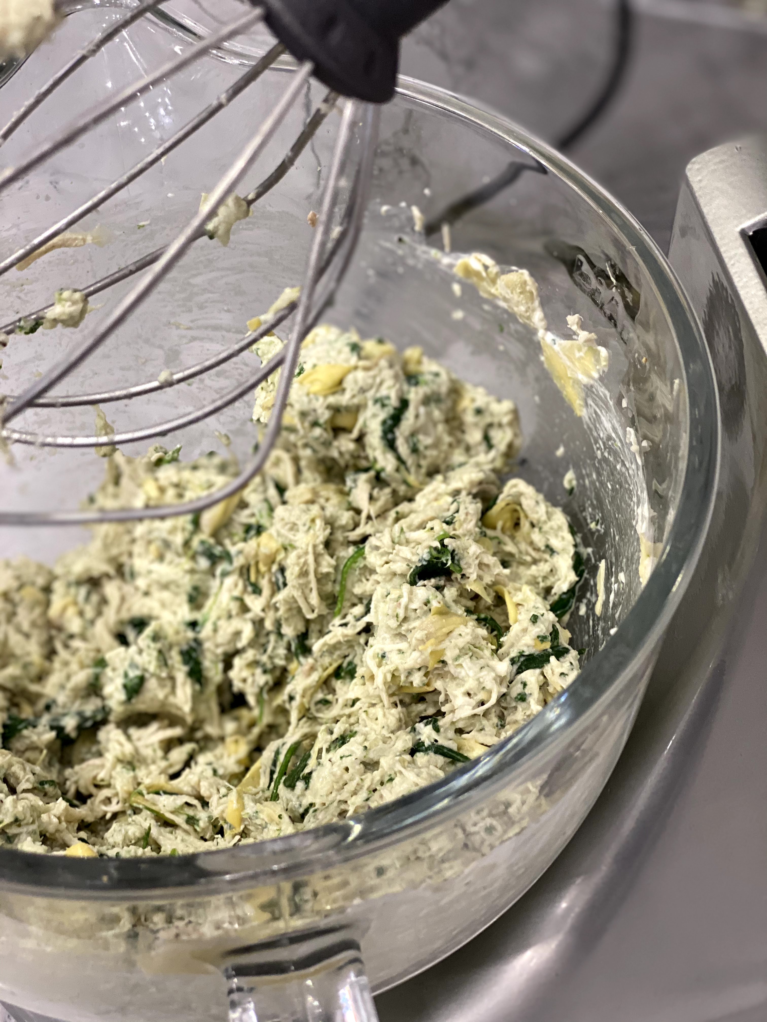 - Combine all stuffing ingredients in the mixer and put on low until fully mixed together and set aside.