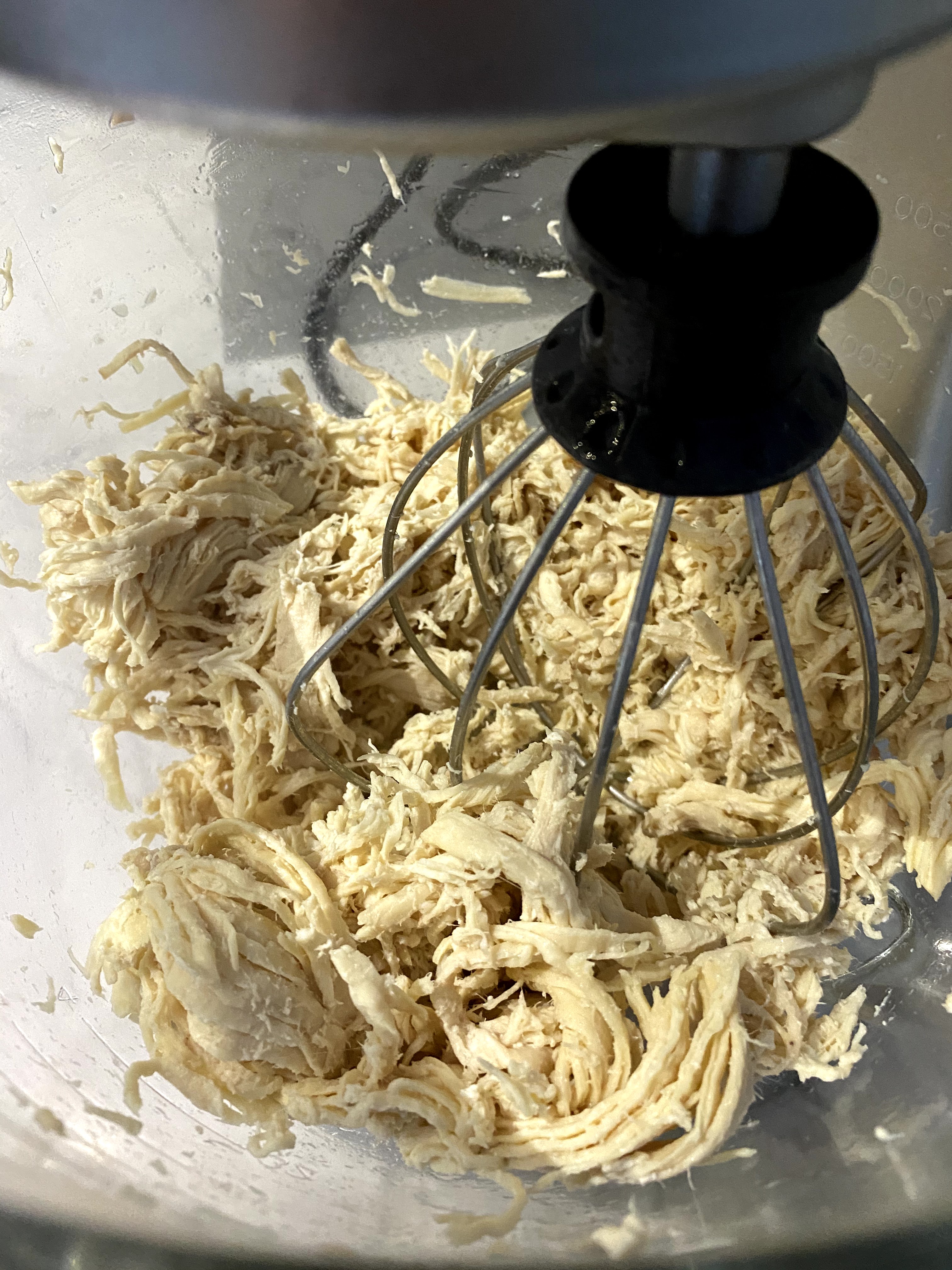 - Remove chicken breast and place into a mixer. Mix on medium until chicken is shredded.