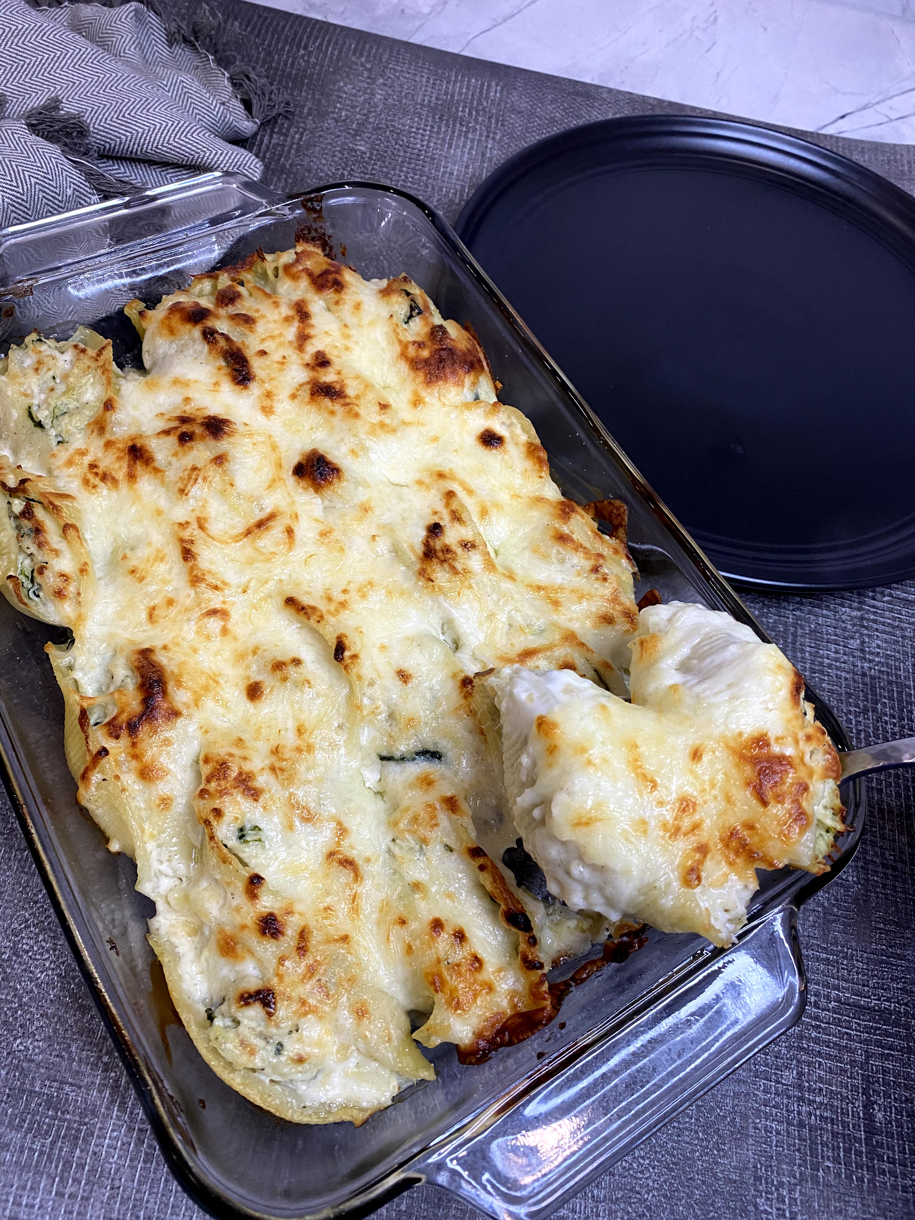 This hearty stuffed shell dish consists of shredded chicken, spinach, artichoke hearts, lots of cheese and alfredo sauce.