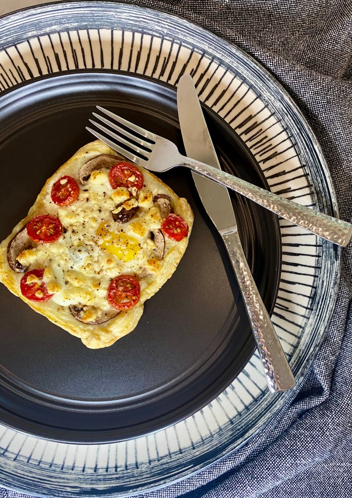 Puff pastry topped with cherry tomatoes, mushrooms, an egg and feta. Baked to perfection.