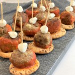 Mozzarella stuffed meatballs are something that I have wanted to make for a while as an appetizer. I love pasta but I am always trying to come up with new, fun and tasty appetizers. Top the meatballs with a mozzarella pearl for aesthetics and place on one of Joseph’s Mini Pita Bread.