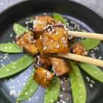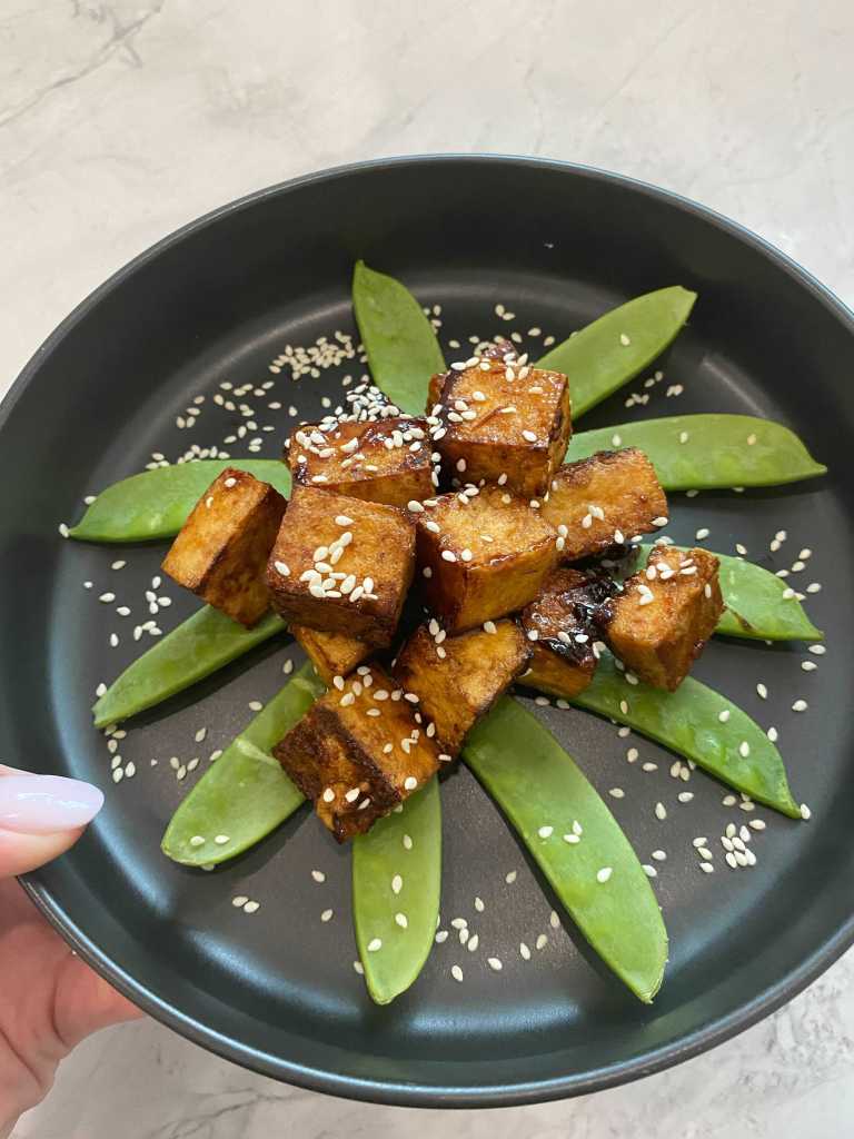 Crispy tofu in a spicy honey garlic sauce served over a bed of snap peas.
