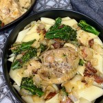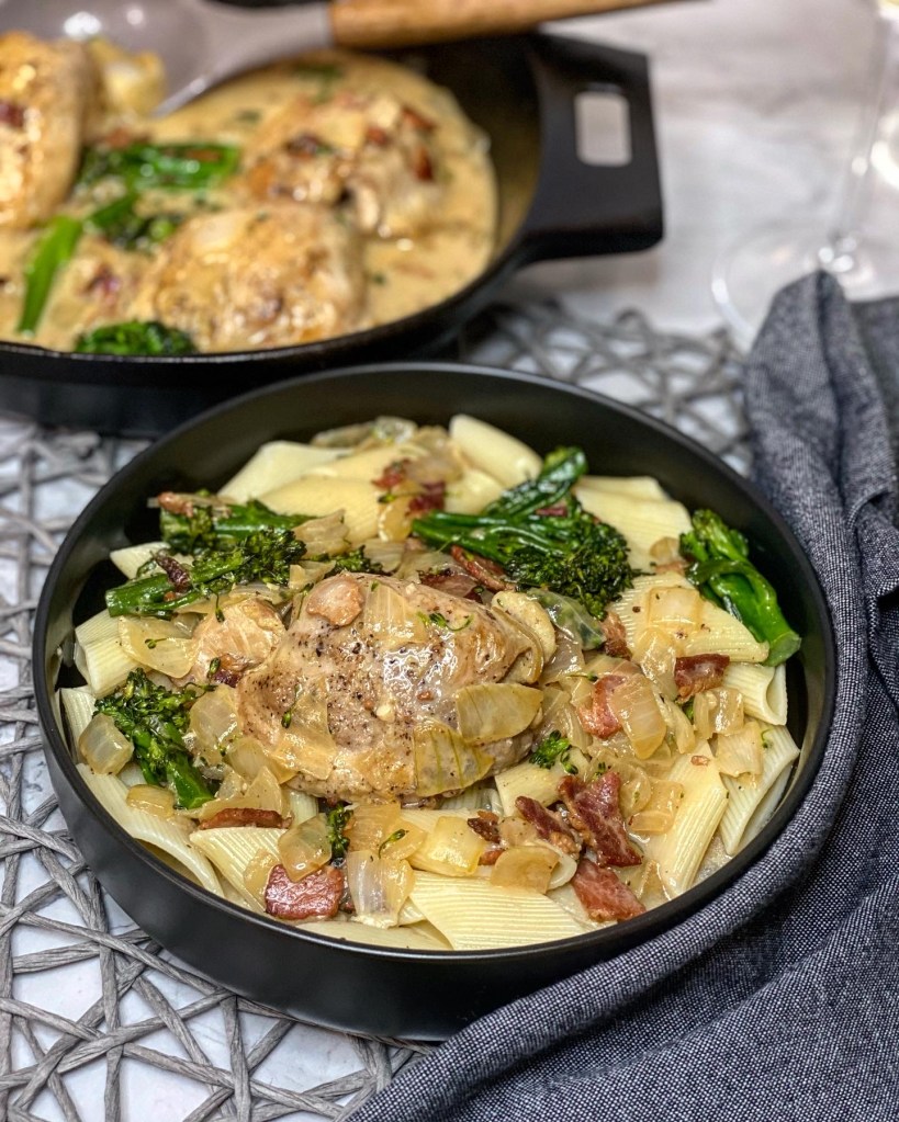 Chicken in a creamy bacon onion sauce with broccolini and large penne.