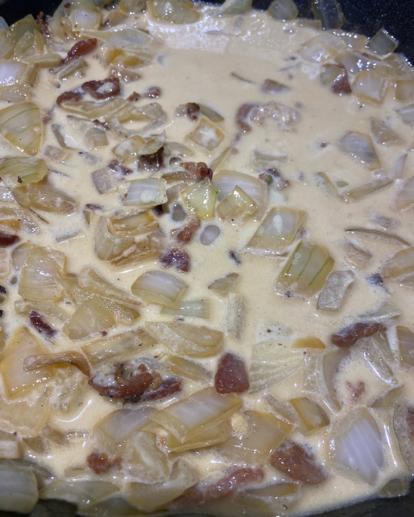 - Cut onion into ¼ inch cubes and cut bacon into ¼-½ inch pieces. trim broccolini or broccoli and cut into 1-2 inch pieces. Dice or press garlic.