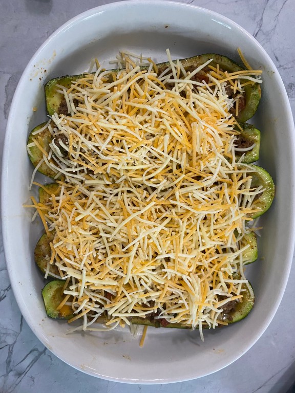- Place zucchini skin down in a pan or baking sheet that is oven safe, carefully place spoonfuls of taco mixture in zucchini boats and then top with shredded cheese.