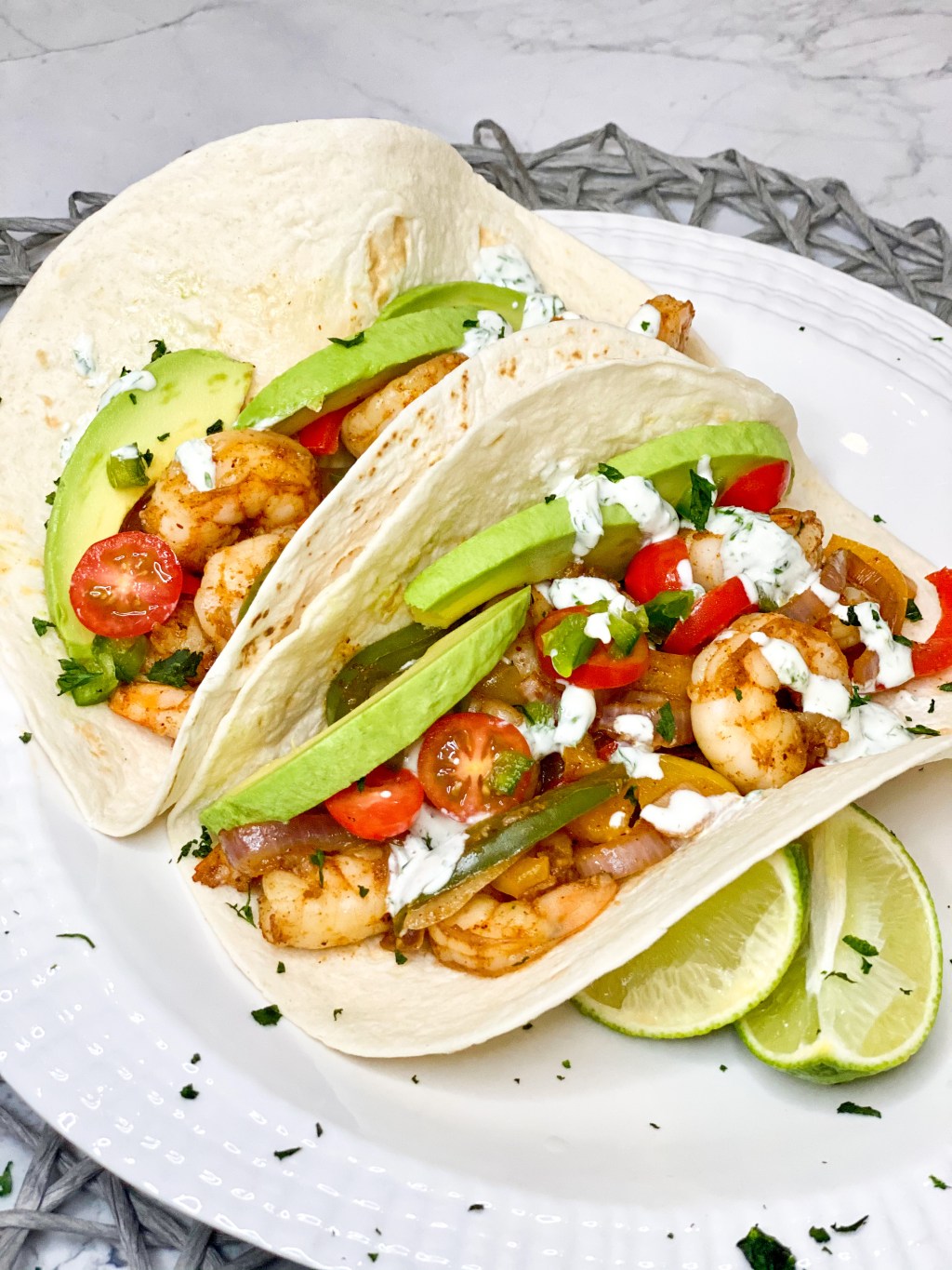 - Place veggie and shrimp fajita mix on a warm tortilla and top with diced jalapeños, cilantro crème, avocado and cheese if desired!