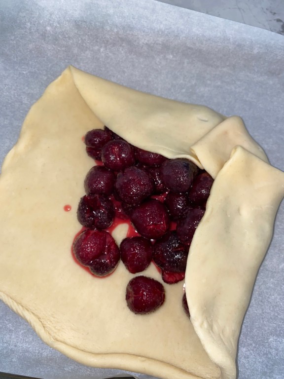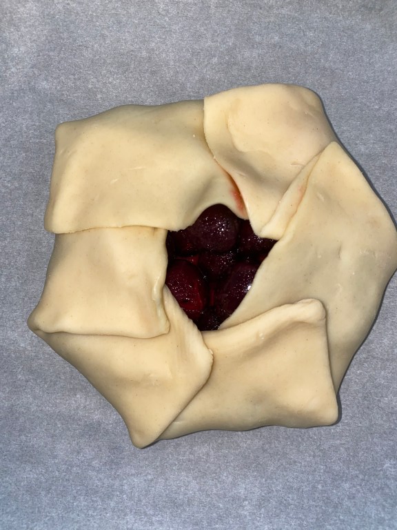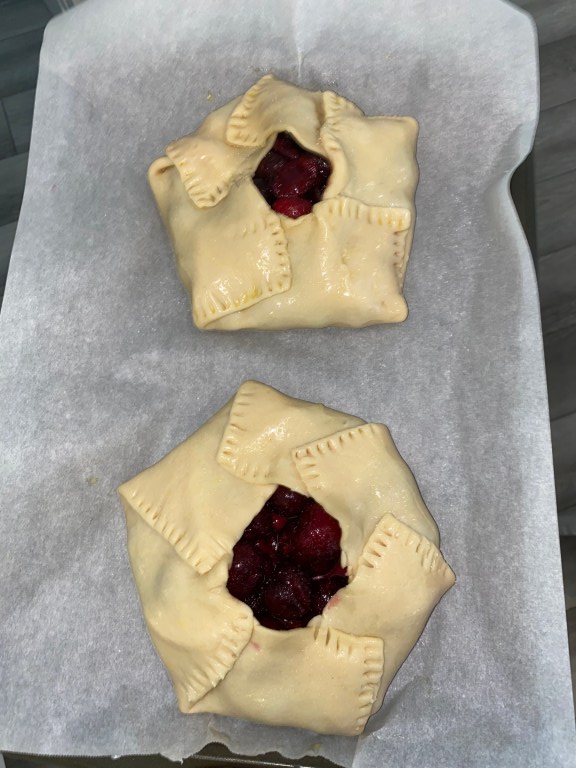 - Assembly! Fold all edges in, making sure you don’t fold too tight or rip the crust. If you do rip the crust it would be best to try to patch it or even trim a little off the edge and place it over the hole. Lightly cover in a egg wash. To make egg wash just mix egg with a tbs of water and brush on.