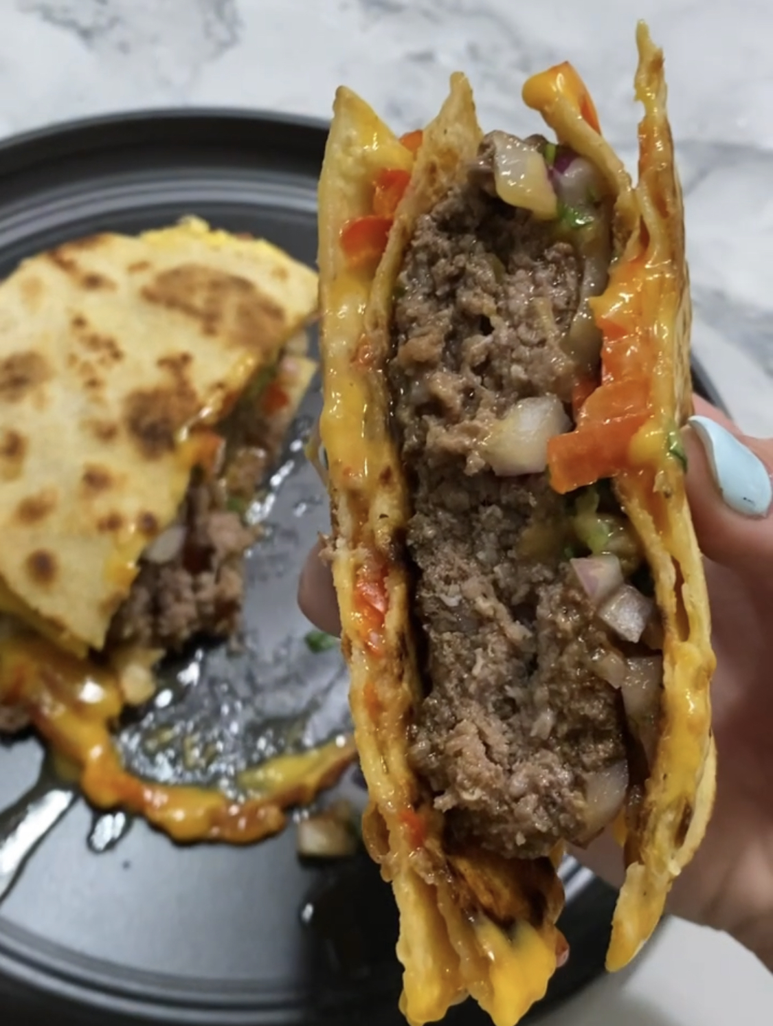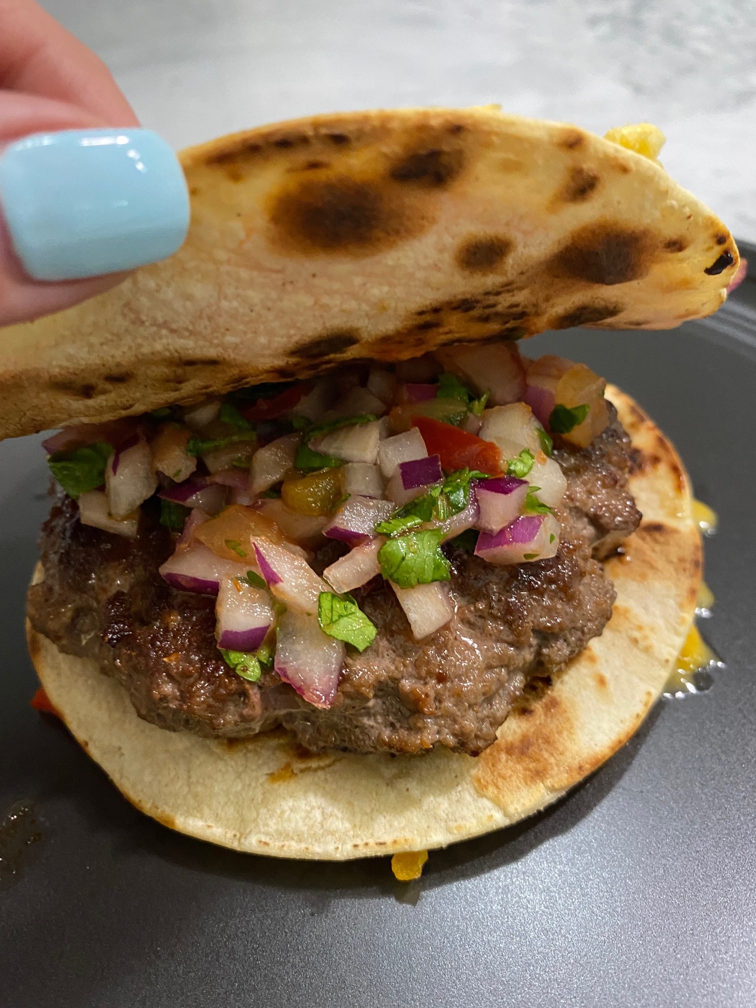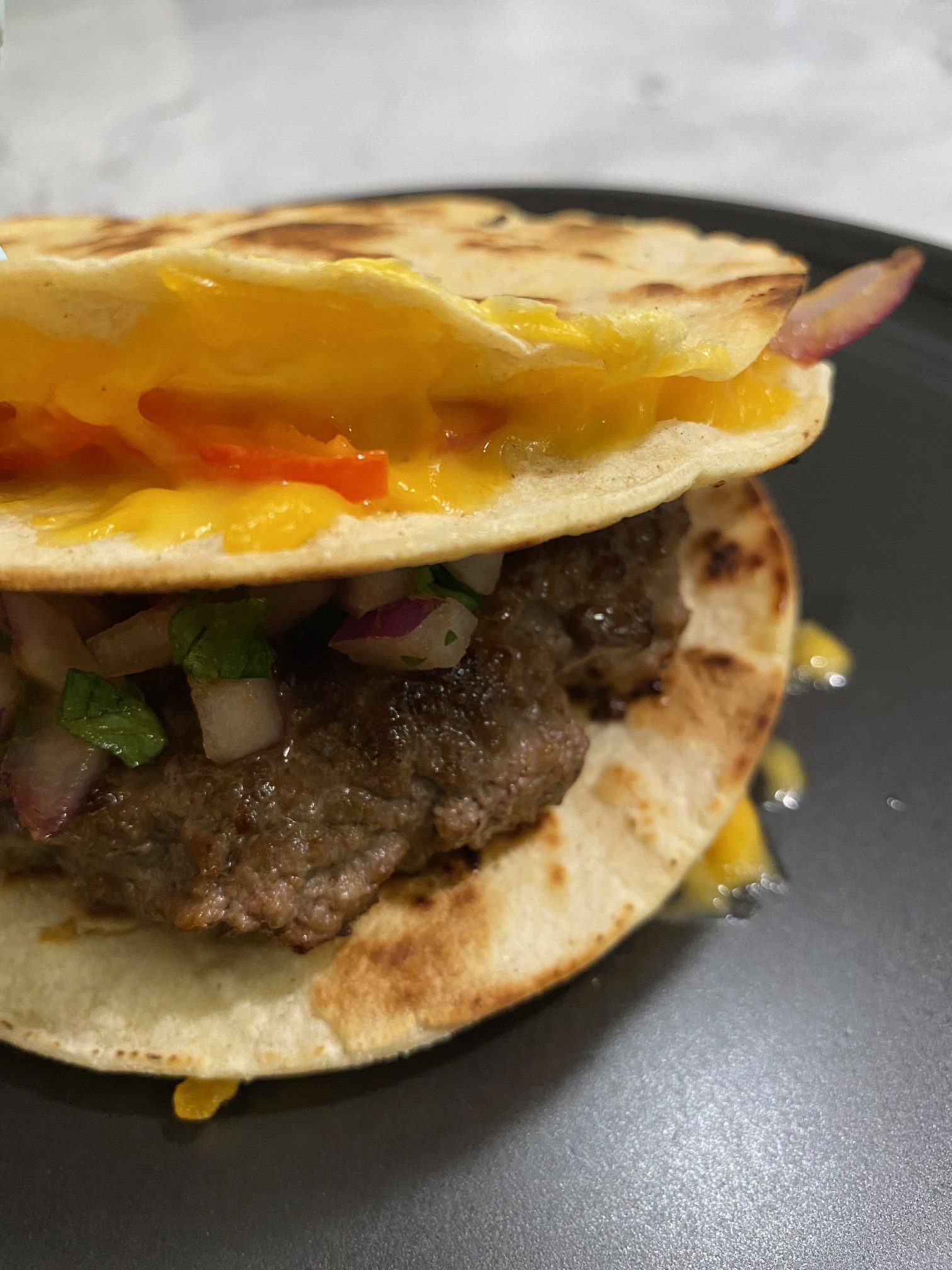 - Assemble by placing one quesadilla on a plate, adding a burger, topping with 2 tbsp. of fresh Pico and finishing with another quesadilla. Enjoy! PS. don’t burn yourself on the cheese