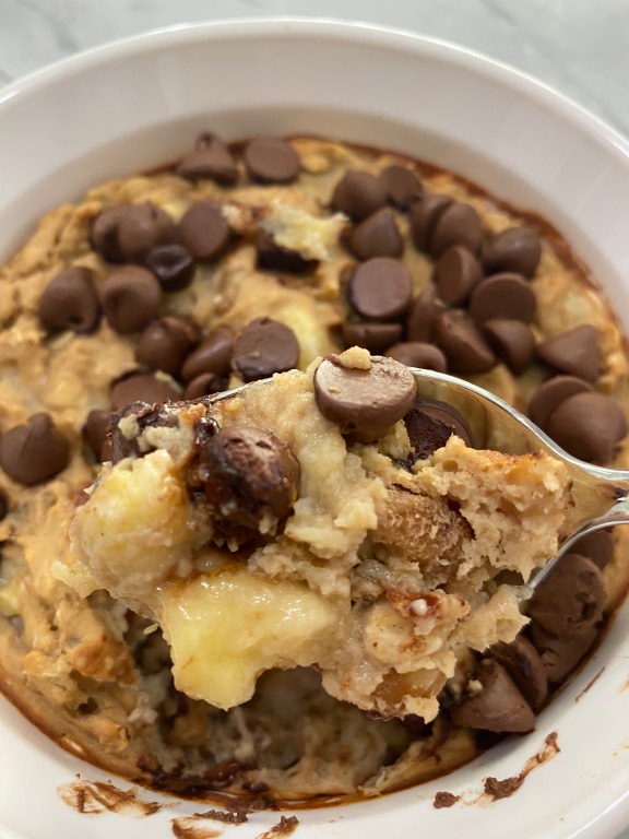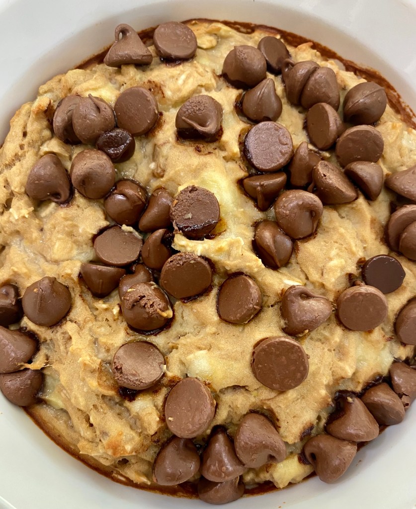 - Top with chocolate chips and bake for 20-25 minutes. The top should be lightly browned but center should be soft. Avoid overcooking because it will dry out the dish. You want it to be a mushy consistency.