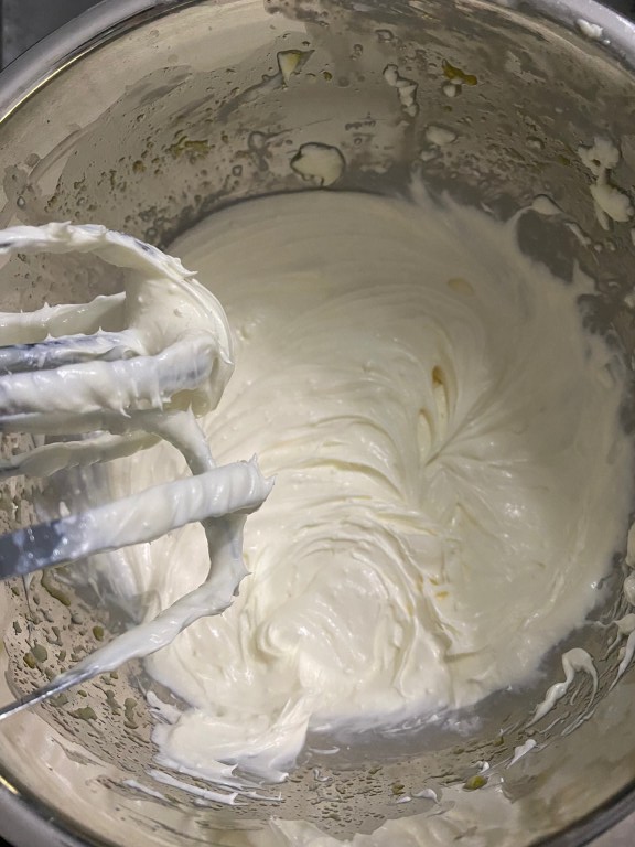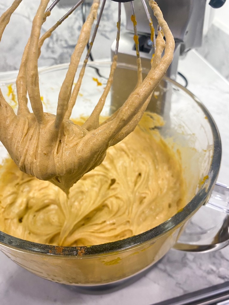 - Once soft and creamy, slowly mix in the powdered sugar and pumpkin spice. Whip until thick and creamy.
