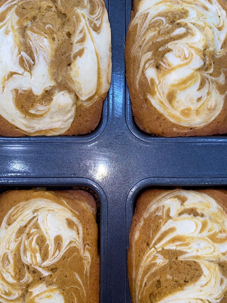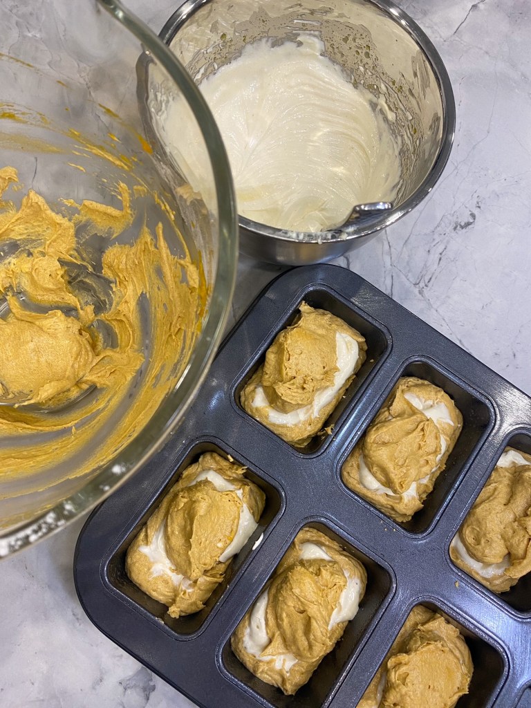 - Spoon batter into pan until ¼ full. Add one tsp of pumpkin pie swirl and gently spread it over the bread batter. Spoon more bread batter on top until it is between ½-⅔ full.